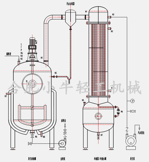 合肥小牛真空減壓濃縮器加熱形式可根據用戶工況設計為蒸汽加熱式或電加熱式,滿足無鍋爐熱源的用戶使用。真空濃縮罐設有夾套及保溫層,夾套內通入蒸汽(蒸汽加熱式)或導熱油(電加熱式)進行加熱,從而給濃縮罐內物料間接傳熱,耐高溫保溫層能有效隔熱保溫,減少能耗,有效避免操作人員燙傷事故發(fā)生。罐體配有視鏡視燈,能夠隨時觀察罐內狀態(tài)。生產完成后,利用CIP自動旋轉清洗球能夠對罐內進行360度沖洗。特殊定制的攪拌裝置有效地避免了料液因濃度過高而出現的粘壁現象,攪拌裝置采用優(yōu)質機械密封,確保不會因高真空而出現漏氣現象。真空濃縮罐內物料受熱而產生的蒸汽中帶有有效成份的泡沫在汽液分離器中被分離出來通過管道回流至罐內,其余二次蒸汽通過列管式換熱器被冷凝成液體,進入冷凝水收集罐,最后排出或回收利用,不凝性氣體隨真空泵一起排出。該設備可進行負壓或常壓操作,也可以進行連續(xù)或間歇生產。