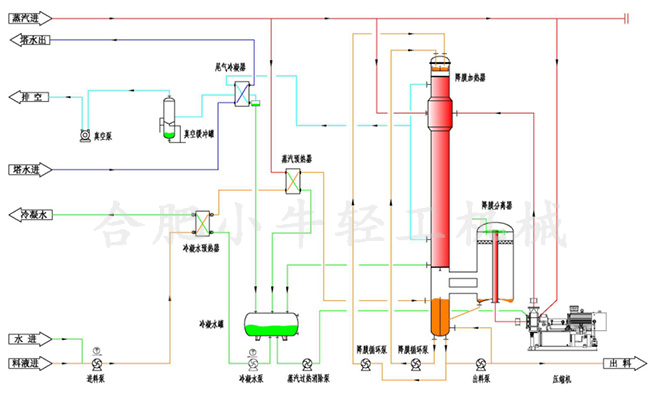 降膜蒸發(fā)器的料液是從蒸發(fā)器的頂部加入,在重力作用下沿管壁成膜狀下降,并在通過加熱管的過程中被蒸發(fā)增濃,在其底部得到濃縮液。MVR降膜蒸發(fā)器將加熱器的產(chǎn)生的二次蒸汽通過壓縮機(jī)的絕熱壓縮,能量進(jìn)行壓縮提升,使其壓力、溫度提高后,再作為加熱蒸汽送入蒸發(fā)器的加熱室,冷凝放熱,使其對(duì)這壓縮過后的二次蒸汽加以利用,將其二次蒸汽內(nèi)部潛熱進(jìn)行回收。因二次蒸汽的潛熱得到了回收利用,所以該設(shè)備具有節(jié)省能耗的顯著特點(diǎn)。